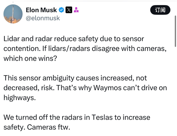 马斯克强调,因此,我们关闭了特斯拉上的毫米波雷达,以提高安全性。摄像头才是关键。
