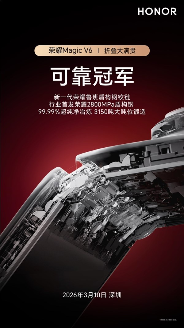 荣耀官方透露,荣耀Magic V6采用了全新一代的荣耀鲁班盾构钢铰链,这种铰链具备航空级的强度,更加耐折。据介绍,该铰链在行业内首次应用了荣耀2800MPa盾构钢,并采用了99.99%超纯净冶炼工艺,经过3150吨大吨位锻造,确保了其卓越的耐用性。
